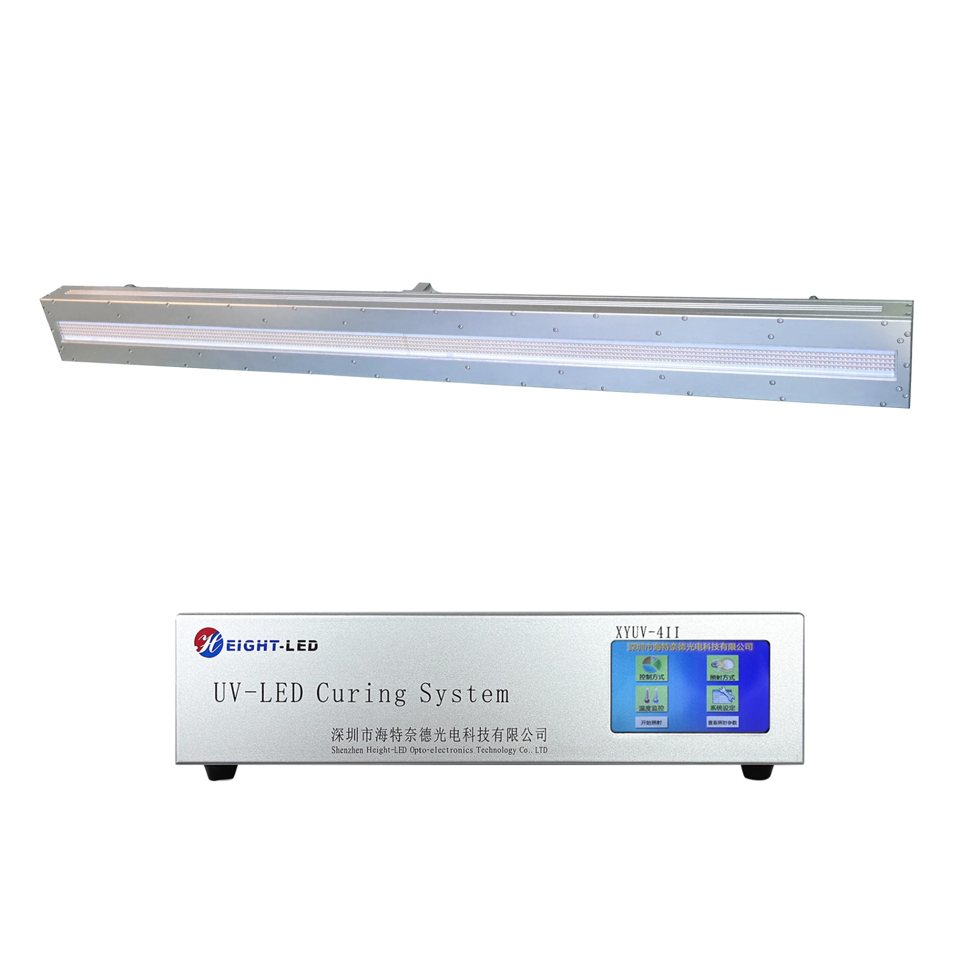 此UVLED照射頭采用進口高強度紫外LED集成,UV光譜波長為395nm,采用強制水冷散熱,有效固化面積為1120X20mm,支持外部信號輸入和觸發。